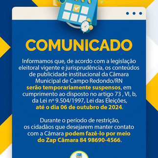 🗣Comunicamos que, de acordo com a legislação eleitoral vigente e jurisprudência, os conteúdos de publicidade institucional da Câmara Municipal de Campo Redondo/RN terão temporariamente suspensos, em cumprimento ao disposto no artigo 73 , VI, b, da Lei nº 9.504/1997, Lei das Eleições, até o dia 06 de outubro de 2024.